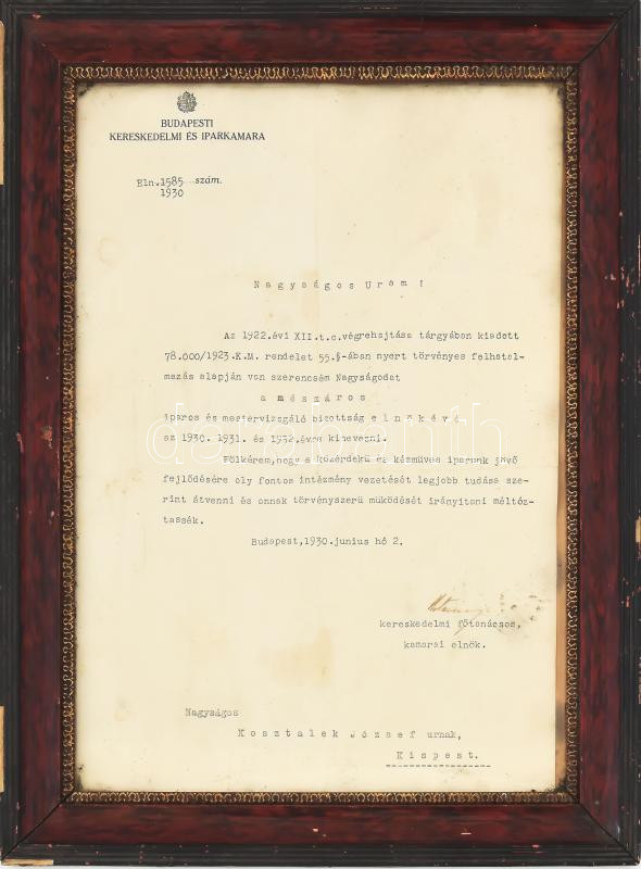 1930 Bp., Kinevezés a mészáros ip. mestervizsgáló bizottság elnökévé https://www.darabanth.com/hu/469-Gyorsarveres/469.0/Mutargy-papirregiseg-egyeb/Okmanyok~500020/1930-Bp-Kinevezes-a-meszaros-ip-mestervizsgalo-bizottsag-elnokeve~II3150112