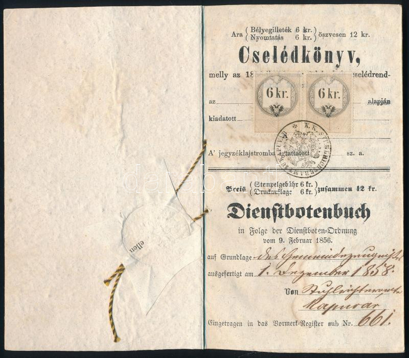 Leírás: 1958 Kaposvár, cselédkönyv 6+6 kr okmánybélyeggel