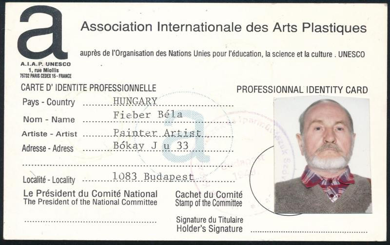 Leírás: 2002 Association Internationale des Arts Plastiques (AIAP) fényképes igazolványa Fieber Béla (1926-2008) festőművész részére