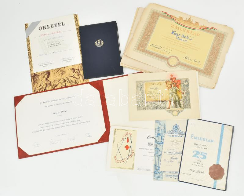 Leírás: cca 1960-86 Szocialista oklevél és emléklap tétel, össz. 19 db, közte néhány vasutas (MÁV), vegyes állapotban, klf. méretekben.