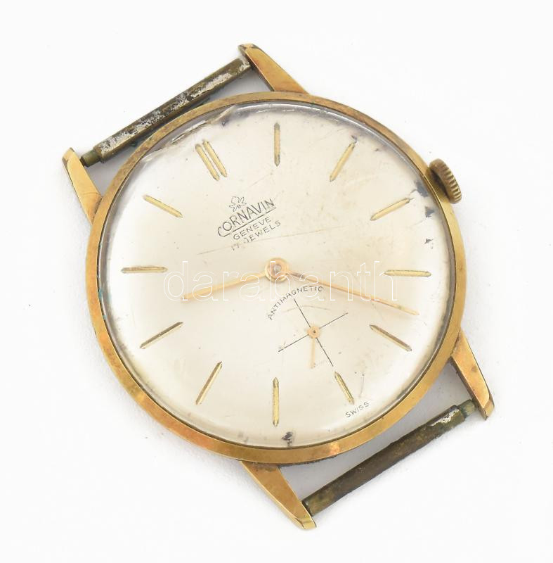 Cornavin 17 köves, kézi felhúzós karóra, kissé karcos, sérült üveggel, némi oxidációval, szíj nélkül. Működik, de a korona csak korlátozottan húzható, javításra szorul. d: 32 mm