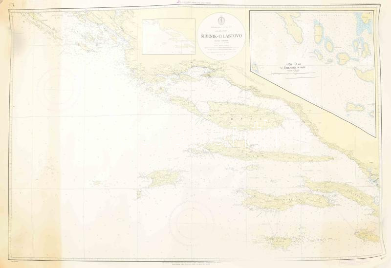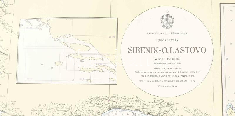 1989 Jugoslavija, Šibenik - O. Lastovo, Jadransko more - istočna obala / Jugoszlávia (Horvátország), az Adriai-tenger keleti partjának térképe. Nagyméretű, horvát nyelvű tengerészeti térkép, 1 : 200.000, Split, Hidrografski institut Jugoslavenske ratne mornarice. Feltekerve, kis gyűrődésekkel, 100x71 cm.