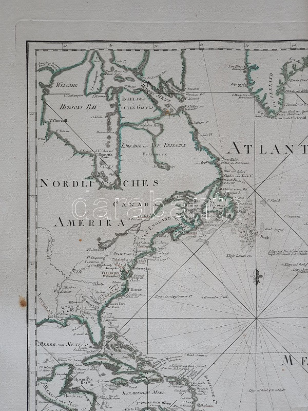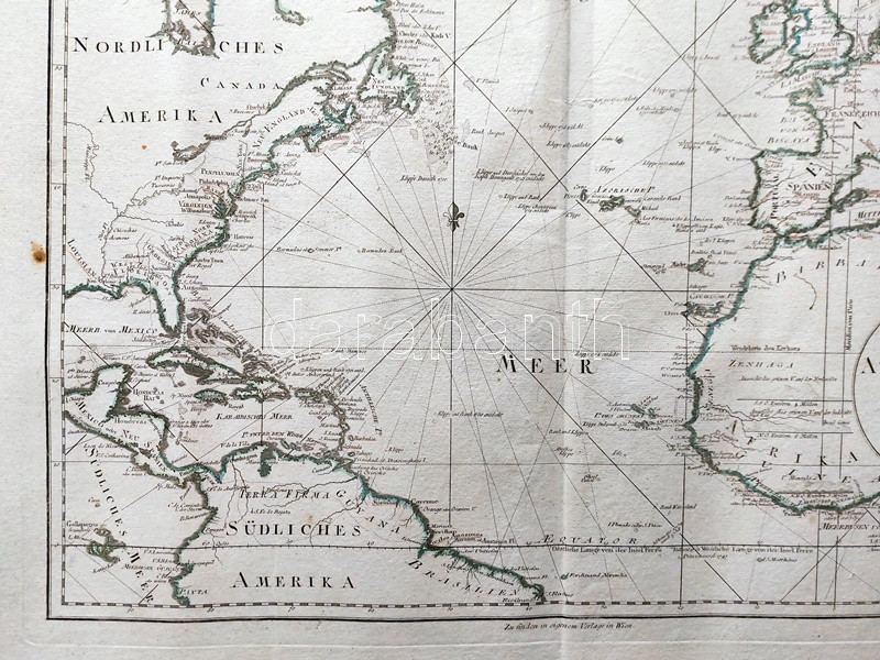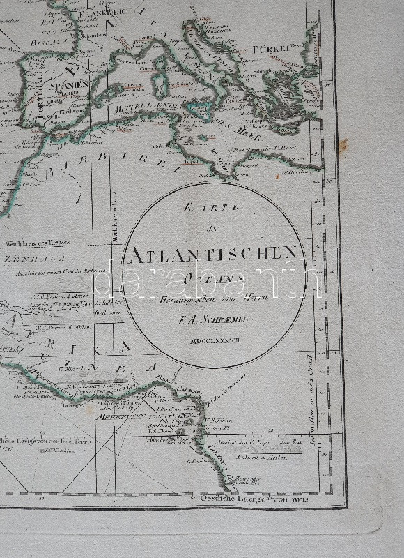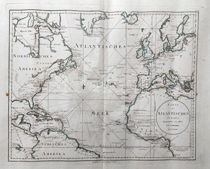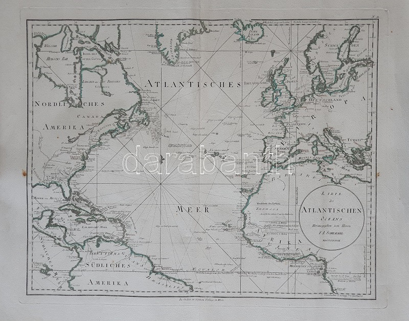 Az Atlanti-óceán északi része. Német nyelven feliratozott, kézzel határszínezett térkép, szerkesztette Franz Anton Schrämbl bécsi térképész (1788). Karte des Atlantischen Oceans. Herausgegeben von Herrn F. A. Schraembl. N. 91. (1788) [Bécs] Wien, [1800]. Franz Anton Schrämbl. Kézzel határszínezett rézmetszet, mérete:490x610 mm, lemezméret: 525x650 mm, lapméret: 645x845 mm. Kézzel határszínezett, míves kivitelű térképünk Franz Anton Schrämbl bécsi térképész monumentális atlaszában, egyben főművében: az ,, Allgemeiner Grosser Atlas" című kötetben jelent meg, annak 91. számú térképmetszeteként. A mintegy másfél évtizedig készülő album végül 1800-ban látott napvilágot. A térképek szerkesztője, Franz Anton Schrämbl (1751-1803) maga alapította térképészeti kiadóját, és lehetőség szerint a legfrissebb térképészeti felmérések alapján dolgozott. Német nyelvű atlanti-óceáni térképe az Egyenlítő tájától Grönlandig ábrázolja az óceánt, Észak-Amerika keleti felét, a karibi szigetvilágot, Dél-Amerika északi részét, az afrikai kontinens zömét és Európa csaknem teljes egészét, egészen a Fekete-tengerig. Térképünk számos érdekes részletet rejteget. Az óceáni partok észak-déli leképezésének első feltűnő vonása az enyhe torzítottság, melynek nyomán Európa és Észak-Amerika lényegesen nagyobbnak tűnik valós méreteihez képest. Térképünk tudatos torzítottságát egyáltalán nem rejtegeti a dokumentum: az Egyenlítőtől távolodva egyre nő a szélességi fokbeosztások egyes fokai közti távolság, ami Európa és Észak-Amerika partjainak lényegesen részletesebb ábrázolását teszi lehetővé. Keleti-nyugati irányban szintén meglepetéseket rejt dokumentumunk. 18. század végi térképünk a keleti-nyugati fokbeosztás eltérő hagyományai szerint kezdő hosszúsági körnek egyaránt felveszi Ferro szigetét, Párizst és Londont. A Kanári-szigetek legnyugatabbi tagját, El Hierro (Ferro) szigetét már az ókortól tengerészeti alappontként használták, hiszen az ismert világ e ponttól teljes egészében keletre helyezkedett el. Az antik hagyományt átvéve, a nemzeti tengerészeti szabványosítás érdekében Richelieu bíboros javaslatára 1634-ben kezdő délkörnek Ferro szigetét vették fel, a szabványt számos állam átvette, ám a maga körében a francia és az angol hajózás más hagyománnyal is élt, ennek megfelelően a térképészetben elterjedt a párizsi, illetve londoni kezdőmeridián is. A tájékozódás megkönnyítése érdekében térképünk mindhárom beosztást feltünteti. Dokumentumunk zöld színnel emeli ki a kontinensek és a hozzá tartozó szigetek határvonalait. A hajózás biztonságát elősegítendő térképünk utal egyes tengerszakaszok kisebb tengermélységére is, a földrészek tekintetében pedig elsősorban a tengerészeti szempontból jelentősebb folyókat tünteti fel. Térképünk a kontinensek belső részei és domborzati viszonyai iránt kevéssé érdeklődik, az atlanti hajózás szempontjából mellékes területeken fontos folyók és folyómenti városok fel sem tűnnek. Így érhető, hogy az olasz, spanyol, francia, angol és az új-angliai partvidékek városhálózata részletesen dokumentált, és szerepel mappánkon a tengermelléki Szentpétervár is; ám az atlanti navigáció szempontjából kevésbé lényeges Közép-Európa fő folyója, a Duna fel sem tűnik a térképen, ahogyan a Duna menti fontos városok: Belgrád, Buda, Bécs sem szerepelnek, jóllehet, a térkép maga, illetve a monumentális atlasz, amelynek végül részét képezte térképünk, Bécsben készült. Szép állapotú lap, hátoldalán régi tulajdonosi bélyegzéssel, illetve erősítő papírcsíkkal.
