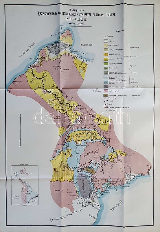 Északboengkoe és a Bongkavidék (Kelet-Celebesz) átnézetes geológiai térképe. Ifjabb Lóczy Lajos térképe. Mérték: 1 : 200,000. [1928 körül] Budapest, [1928]. Klösz György és Fia Térképészeti Műintézete. Színes térkép, mérete: 653x470 mm egy 750x520 mm méretű térképlapon. Ifjabb Lóczy Lajos geológus a Holland-Amerikai Petróleum Társaság megbízásából 1927 decemberében indult el a holland kezelésben álló indonéziai szigetvilág jelentős szigetére, Celebeszre, feltérképezni annak addig feltáratlan területeit a sziget középső nyúlványán. A magyar tudós svájci és holland tanársegédek, öt helyi térképész és 180 főnyi segédcsapat társaságában tárta fel Közép-Celebesznek a Tomini- és Tomori-öböl között elhelyezkedő, áthatolhatatlan esőerdők borította, magas hegyekkel tagolt, nagyjából fél-dunántúlnyi területét a Bongka folyó mentén. Az 1928-as év hét hónapján át tartó expedíció során a felfedezők legkivált csónakokon közlekedtek, az expedíció néhány segédtagja eltűnt, illetve a komplett társaság komoly spanyolbetegségen esett át, ám a kutatóút végére a vidék geográfiai kérdései megoldódtak. (Budapesti Hírlap, 1928. december 15.) Térképünk színkódolás szerint ábrázolja a feltárt vidék kőzetösszetételét, a térkép feltünteti a vízhálózat, a domborzat részleteit is, illetve egyes települések is megjelennek a térképen. Jó állapotú térkép, hajtogatva.