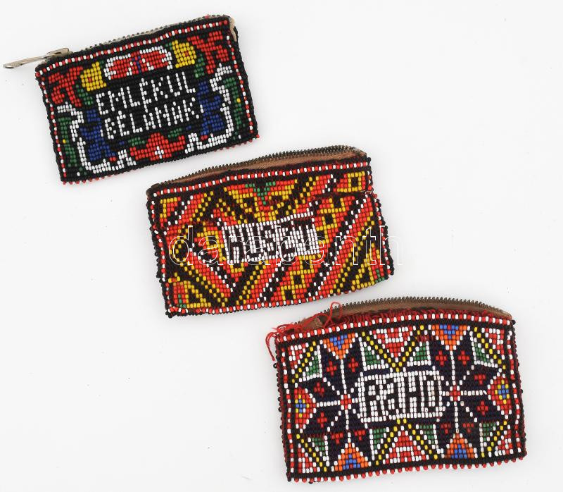 Leírás: cca 1940, 3 darab gyöngyfűzött erszény a Magyarországhoz visszacsatolt területek emlékére, városnevekkel, hiánnyal, 10x8 cm alatt