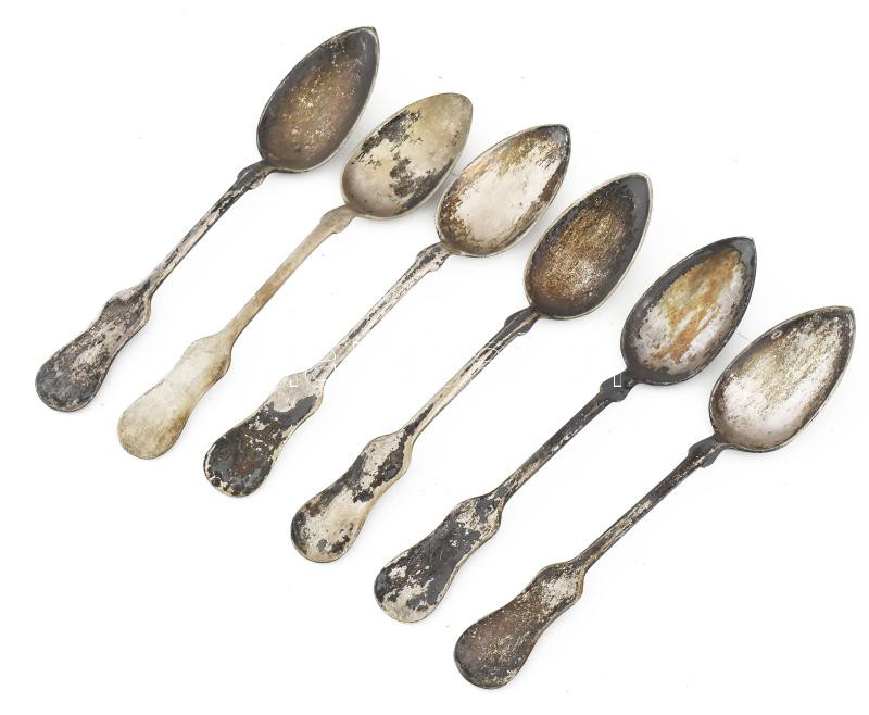 Ezüst (Ag), kiskanál szett, 6 darab, jelzett, nettó: 148g https://www.darabanth.com/hu/469-Gyorsarveres/469.0/Nemesfem-disztargyak-ekszerek-dragakovek/Nemesfem-disztargyak-ekszerek-dragakovek~1000036/Ezust-Ag-kiskanal-szett-6-darab-jelzett-netto-148g~II3173457