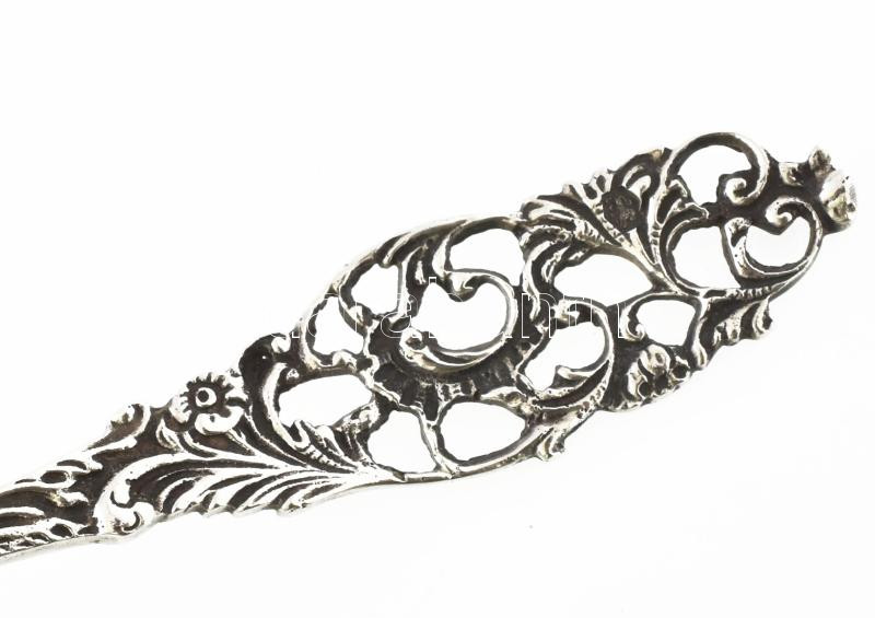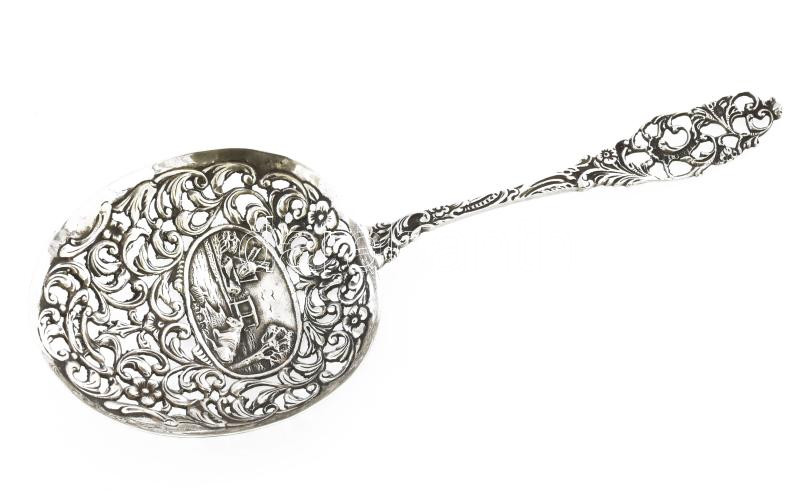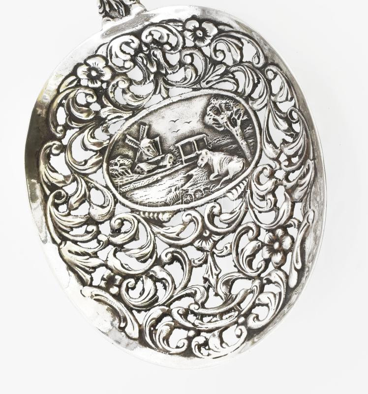 Leírás: Habos kanál. Szélmalom domborművel, Áttört . Ezüst (Ag) jelzett 18,5 cm, 40 g