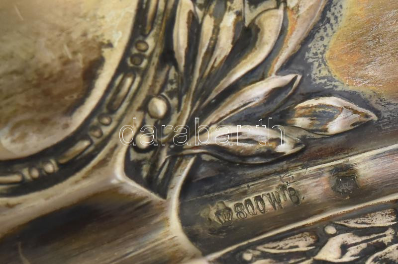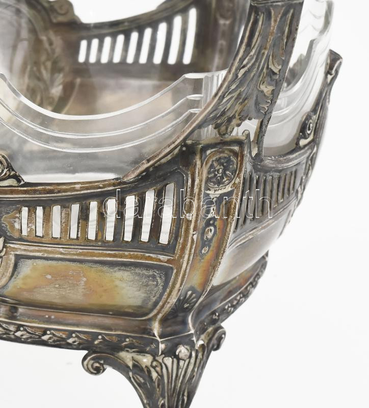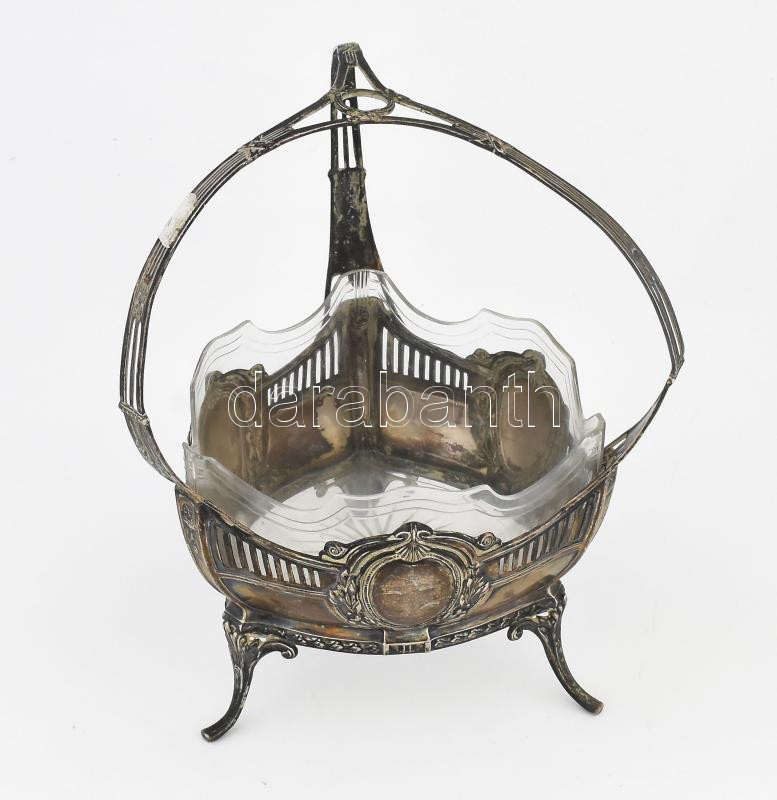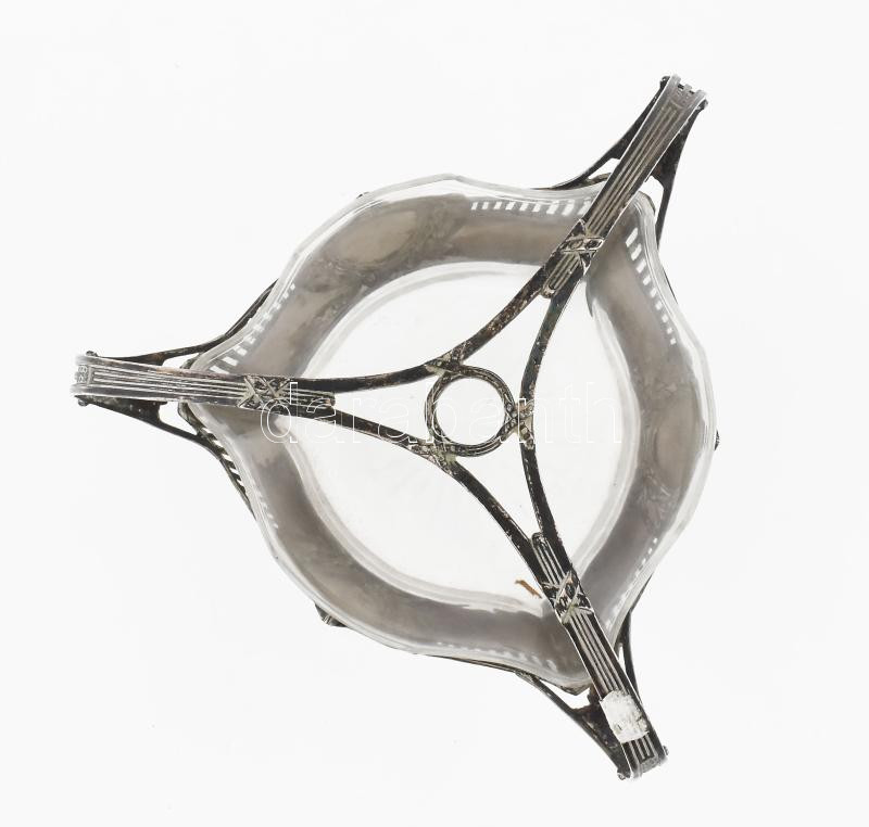 Szecessziós ezüst (Ag) kínáló, üvegbetéttel. Három lábon támaszkodó, áttört peremrészt és medalionokat magába foglaló növényi mintás szereléktest, három egybeívelő kötegelt fogóval, köszörült mintás eredeti öntött üvegbetéttel, m: 25 cm, nettó: 275g
