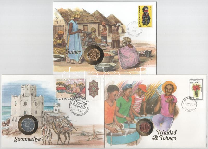 Leírás: 3xklf érmés boríték tétel, mind német nyelvű tájékoztatóval, benne: Guinea, Szomália, Trinidad & Tobago