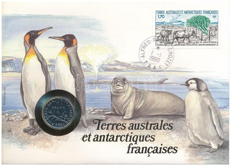 Francia Déli és Antarktiszi területek felbélyegzett borítékban, bélyegzéssel, német nyelvű tájékoztatóval, benne Franciaország 1989. 1Fr Ni T:UNC