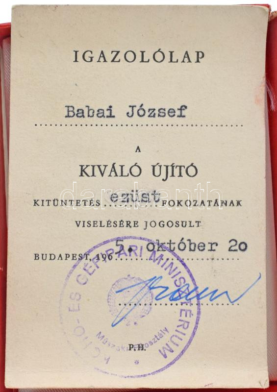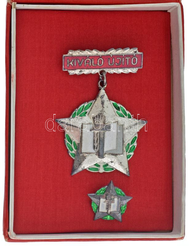 Leírás: 1965. "Kiváló Újító" zománcozott, ezüstözött bronz jelvény miniatűrrel, igazolvánnyal, sérült tokban T:XF