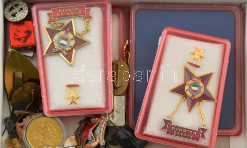 28db-os vegyes szocialista kitüntetés, jelvény tétel, több tokkal és miniatűrrel, közte "Kiváló Dolgozó" kitüntetések, "Munkásőr" sapkajelvény, iskolajelvények T:AU-VF