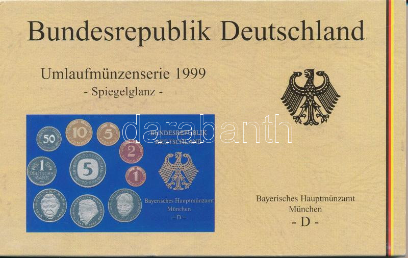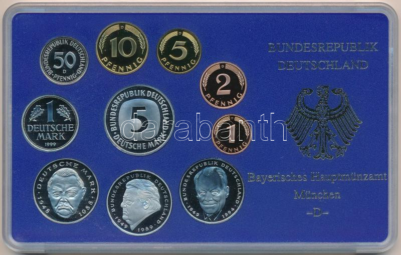 FRG 1999D 1 Pfennig - 5 Mark (10xdiff) coin set in plastic case with cardboard outer case C:PP