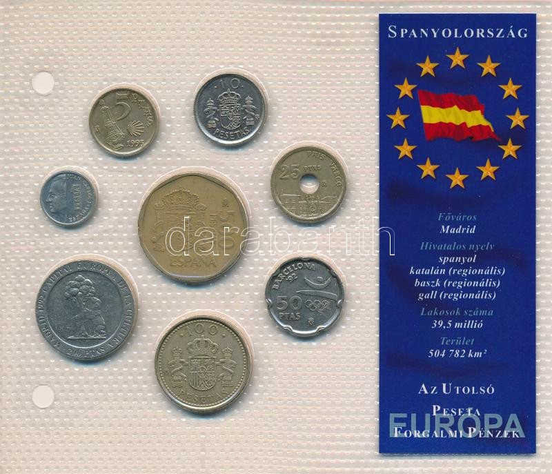 Leírás: Spanyolország 1988-1998. 1P-500P (8xklf, közte 4xklf forgalmi emlékpénz) "Európa utolsó pénzei" vákuumcsomagolt forgalmi összeállítás T:XF,VF