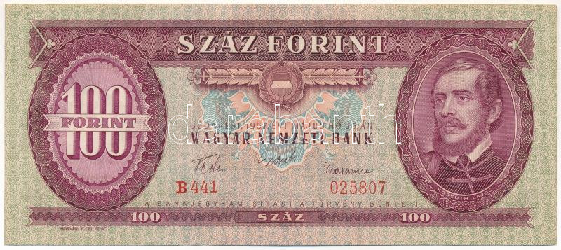 1957. 100Ft "B 441 025807" T:AU hullámos papír Adamo F29 https://www.darabanth.com/hu/469-Gyorsarveres/469.0/Numizmatika/Magyar-bankjegyek~2000008/1957-100Ft-B-441-025807-TAU-hullamos-papir-Adamo-F29~II3168679