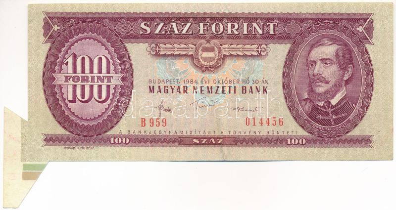 Leírás: 1984. 100Ft "B 959 014456" vágáshibás bankjegy, látványos anyagtöbblettel a bal alsó sarokban T:F Adamo F35