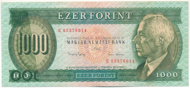 Leírás: 1993. 1000Ft "E 05376014" előlapon látványos, ritka nyomdahibával T:F erős papír Adamo F47