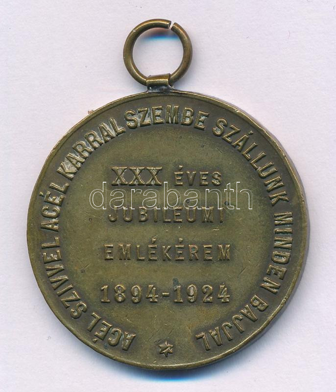 1924. "Diósgyőr M. Kir. Vas és Acélgyári Tűzoltó Testület / XXX éves jubileumi emlékérem 1894-1924 - Acél szívvel, acél karral szembe szállunk minden bajjal" aranyozott bronz emlékérem füllel (36mm) T:XF ph, patina