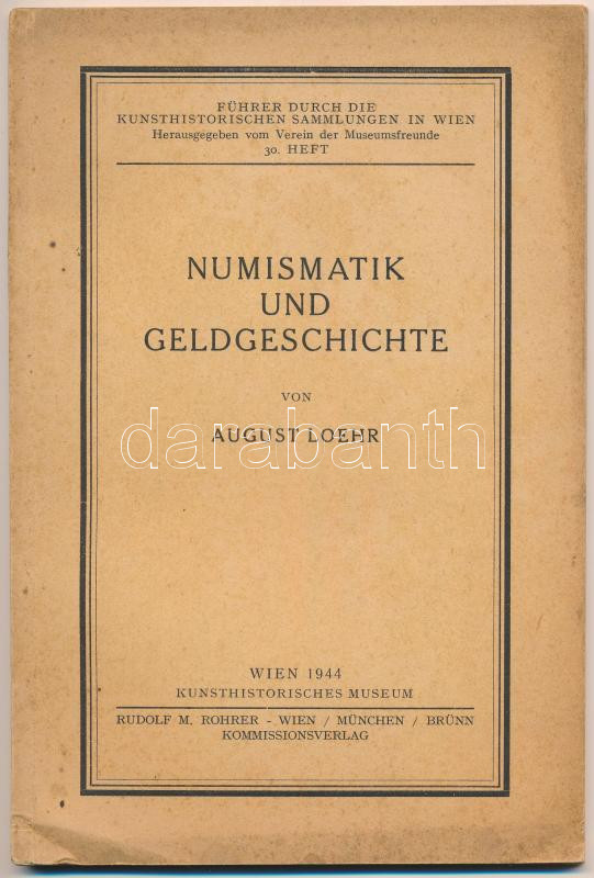 Leírás: August Loehr: Numismatik und Geldgeschichte. Kunsthistorisches Musem, Bécs, 1944. Használt állapotban