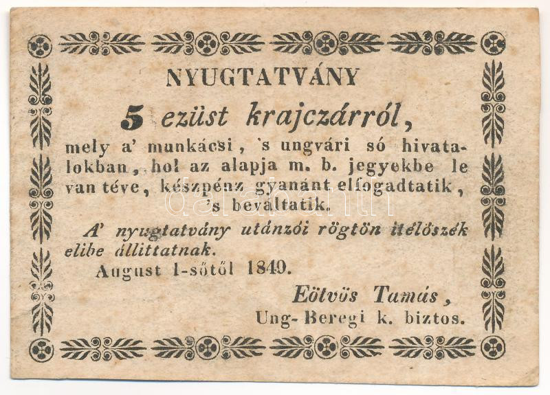 Leírás: Munkács 1849. 5kr nyugtatvány T:F