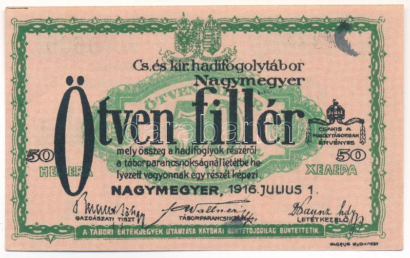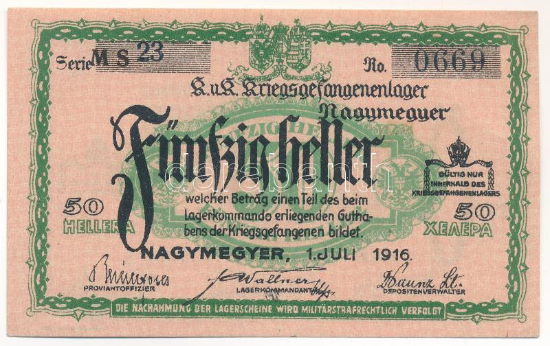 Leírás: Nagymegyer / Hadifogolytábor 1916. július 1. 50f arab sorozat- és sorszámmal, "MS" betűjelzéssel T:AU / Hungary / Nagymegyer / POW camp 07.01.1916. 50 Heller with arabic serial numbers and "MS" C:AU Adamo HHN-1.3.1