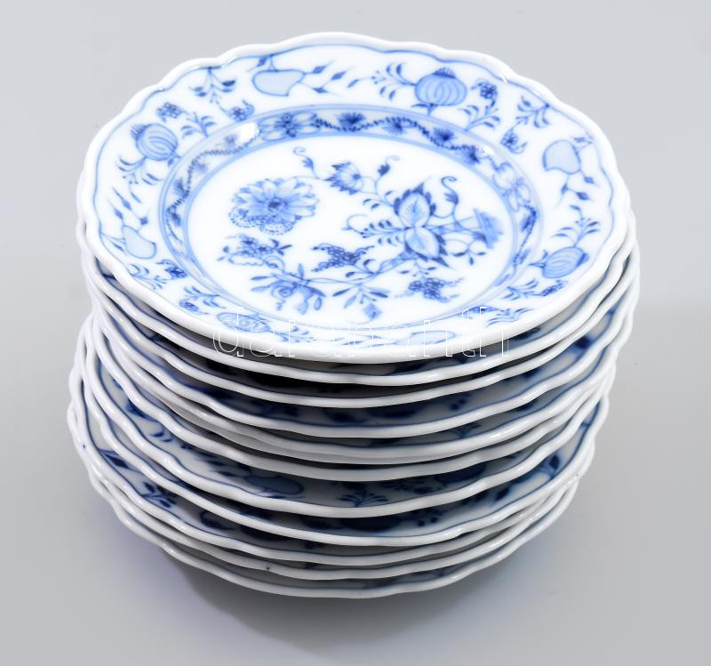 Leírás: 12 db Meisseni porcelán süteményes tányér Máz alatti kék festéssel, jelzett, kisebb kopásokkal d: 17 cm