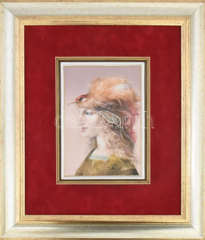 Leírás: Hollóházi Szász Endre festményével díszített porcelán kép, 14x18 cm. Matricás, jelzett, keretben 41x35 cm