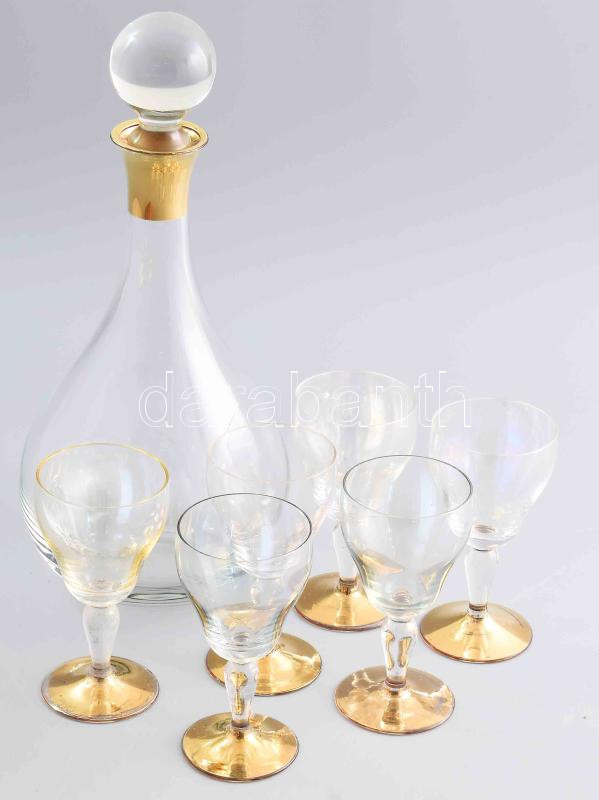 Leírás: Antik likőrös készlet enyhén irizáló üveggel, kissé kopott aranyozással, m: 29 cm, poharak m: 12 cm