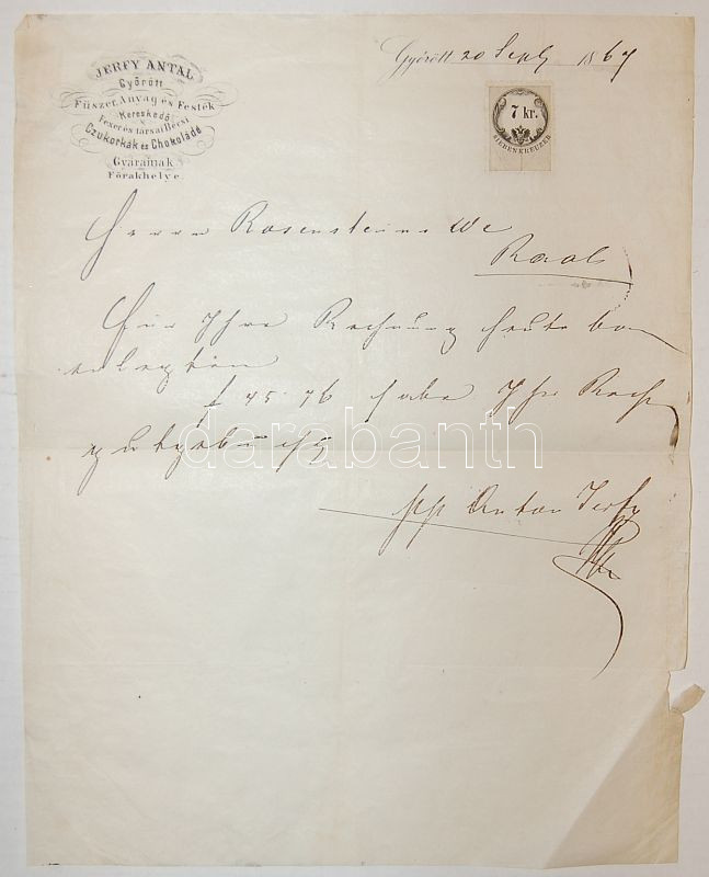 1867 Díszes fejléces levél arany csillogású tisztával írva, rajtva feh... https://www.darabanth.com/hu/47-Gyorsarveres/47.0/Festmeny-mutargy-papirregiseg-egyeb/Okmanyok~133/1867-Diszes-fejleces-level-arany-csillogasu-tisztaval-irva-rajtva-feher-papiru-7kr-illetC3~II94518