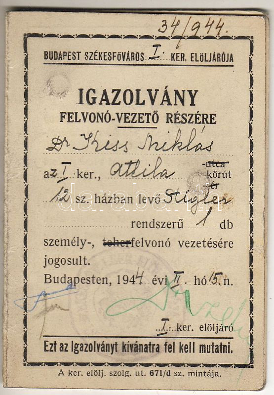 1944 Felvonó-vezető igazolvány https://www.darabanth.com/hu/47-Gyorsarveres/47.0/Festmeny-mutargy-papirregiseg-egyeb/Okmanyok~133/1944-Felvono-vezeto-igazolvany~II94114