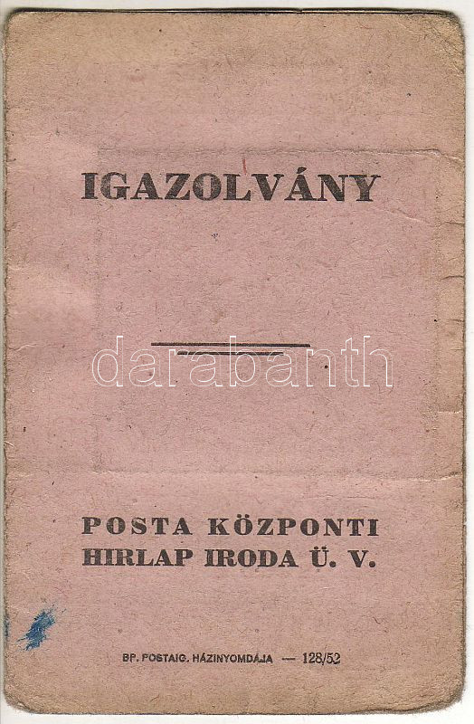 1952 Hirlap ellenőri igazolvány https://www.darabanth.com/hu/47-Gyorsarveres/47.0/Festmeny-mutargy-papirregiseg-egyeb/Okmanyok~133/1952-Hirlap-ellenori-igazolvany~II94111