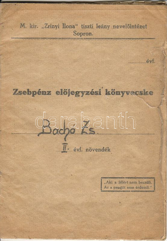 soproni Zsrínyi Ilona tiszti leánynevelőintézet zsebpénz előjegyzési k... https://www.darabanth.com/hu/47-Gyorsarveres/47.0/Festmeny-mutargy-papirregiseg-egyeb/Okmanyok~133/soproni-Zsrinyi-Ilona-tiszti-leanynevelointezet-zsebpenz-elojegyzesi-konyvecske~II94119