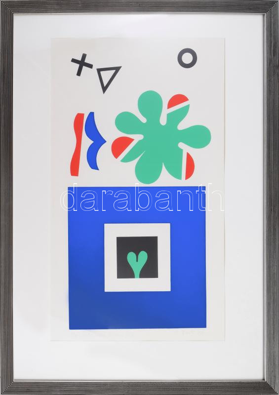 Bartl József (1932-2013): Hétlevelű lóhere, 1980. Szitanyomat, papír. Jelzett. Számozott (4/80). Hátoldalán Magyar Nemzeti Galéria kiviteli bélyegzővel és Generalart Vállalat címkéjével. Üvegezett fakeretben. Paszpartun Bartl szárazbélyegzővel. 55x27 cm. Jótékonysági árverés Bartl József festményéből és szitanyomataiból. A Ferenczy Múzeumi Centrum életműkiállítást rendez Bartl József festőművész születésének 90. évfordulója alkalmából 2024. szeptember 14. - 2025. február 1. között, amelyet egy 208 oldalas katalógus kísér. A kétnyelvű katalógus az első igazán átfogó kiadvány a művész munkásságáról: két alapos tanulmánnyal, részletes életrajzi adatokkal és több mint 100 frissen fotózott, gondosan válogatott reprodukcióval tekinti át a teljes életművet. A tervezett reprezentatív katalógus méltó emléket állít Bartl József művészetének, amely a realisztikus csendéletfestészettől egészen a szentendrei festészeti hagyományokat beépítő motívumhasználatig és az absztrakcióig jutott el, a múzeum azonban jelenleg csak az online megjelenést tudja támogatni. A nyomdaköltség minimális összege 3,5 millió forint. Bartl József jogörököse jóvoltából egy festményt és több szitanyomatot árverésre bocsátunk. A szív, a kereszt, négyzet és nem utolsó sorban a nem csak a természetben ritkábban előforduló hétlevelű lóhere Bartl József művészetének alapvető motívumai, jelei, jelképei, amelyekből kompozícióit az 1970-es évek végétől egészen az élete végéig építette, ezáltal vált művészete egyedivé, összetéveszthetetlenné. Ezen szitanyomat előképe az 1978-ban festett "Tavasz" c. festménye, maga a grafika a Szentendrei Grafikai Műhely alapításának évében, 1980-ban készült, ezáltal a Szentendrén készült első Bartl szitanyomatok egyike. A hátoldalán található Magyar Nemzeti Galéria kiviteli bélyegző és Generalart Vállalat címke alapján minden valószínűség szerint kiállításra került az 1980-as években külföldön, feltételezhetően Németországban.