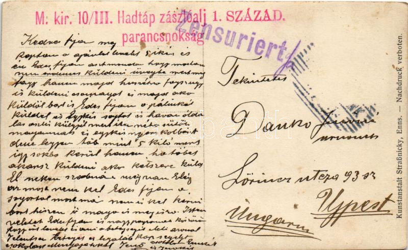 Leírás: Enns. Kunstanstalt Strassnicky photo + "M. kir. 10/III. Hadtáp zászlóalj 1. század parancsnokság" (EK)