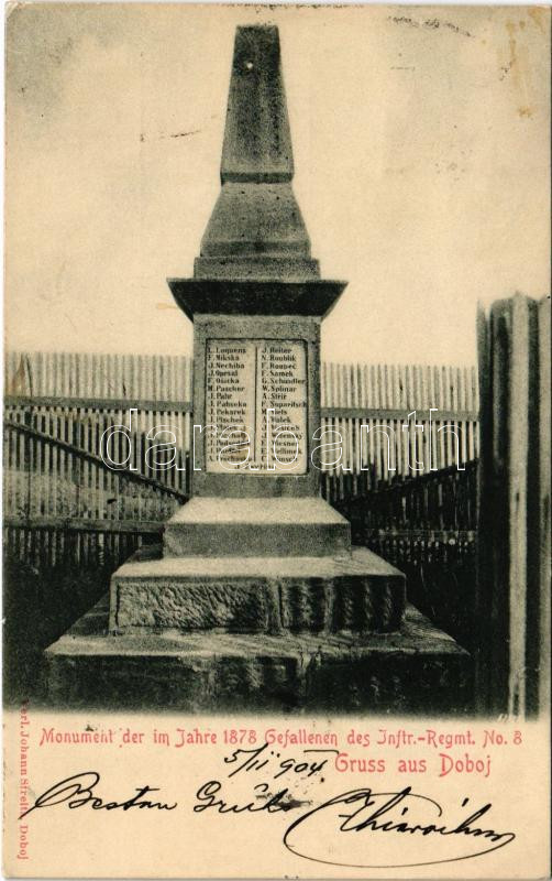 1904 Doboj, Monument der im Jahre 1878 Gefallenen des Inftr.-Regmt. No... https://www.darabanth.com/hu/470-Gyorsarveres/470.0/Kepeslapok/Bosznia-Hercegovina~2000034/1904-Doboj-Monument-der-im-Jahre-1878-Gefallenen-des-Inftr-Regmt-No-8-KuK-military~II3181126