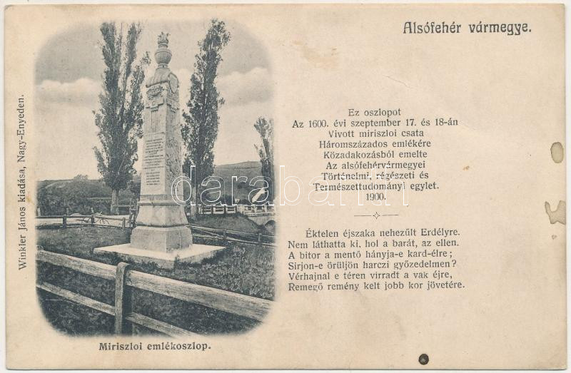 1910 Miriszló, Mirislau (Nagyenyed, Aiud); Alsófehér vármegye, az 1600. évi Miriszlói csata emlékműve. Winkler János kiadása / monument of the Battle of Miraslau (1600)