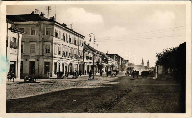1942 Szászrégen, Reghin; Gróf Teleki Pál utca, étterem, Birthler Rádió üzlet, magyar katonák teherautóban / street, restaurant, shop, Hungarian soldiers in truck