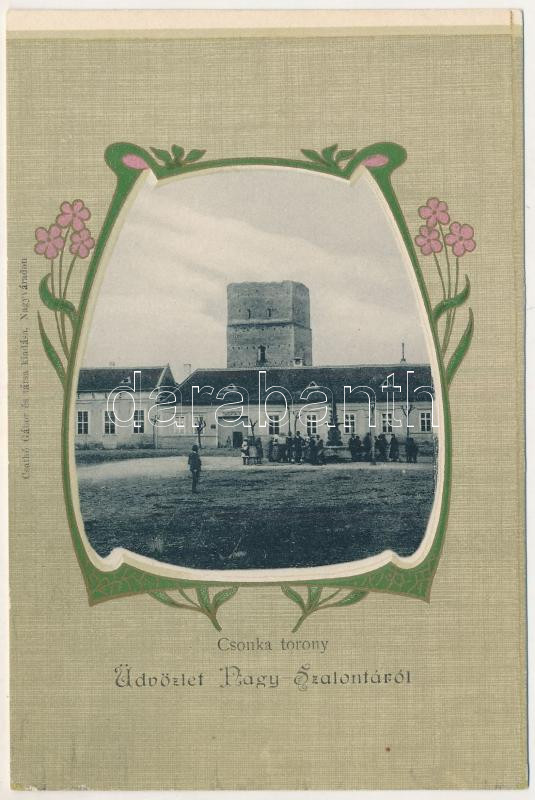 Leírás: Nagyszalonta, Salonta; Csonka torony, kávéház, takarékpénztár. Csathó Gábor és társa kiadása / tower, savings bank, cafe. Art Nouveau, floral