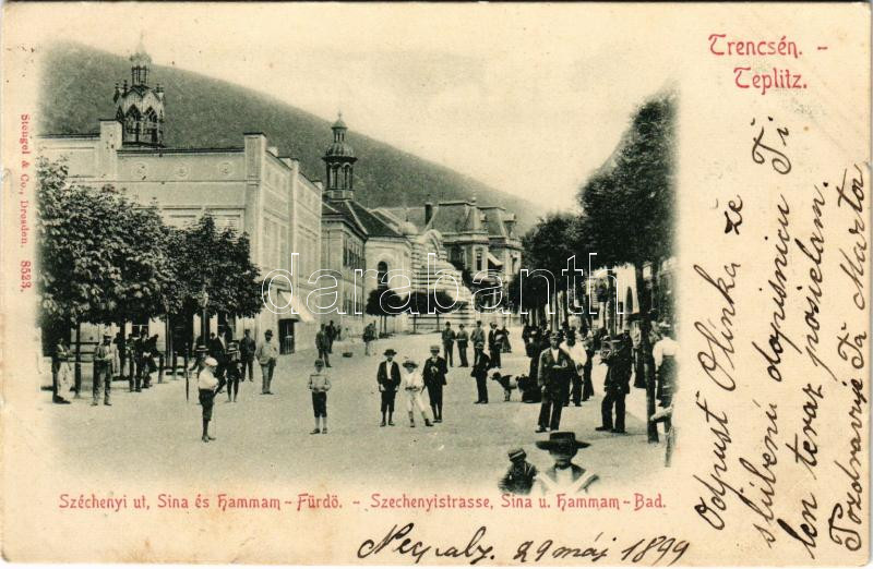Leírás: 1898 (Vorläufer) Trencsénteplic, Trencianske Teplice; Széchenyi út, Sina és Hammam fürdő / street view, spa, baths (kis szakadás / small tear)