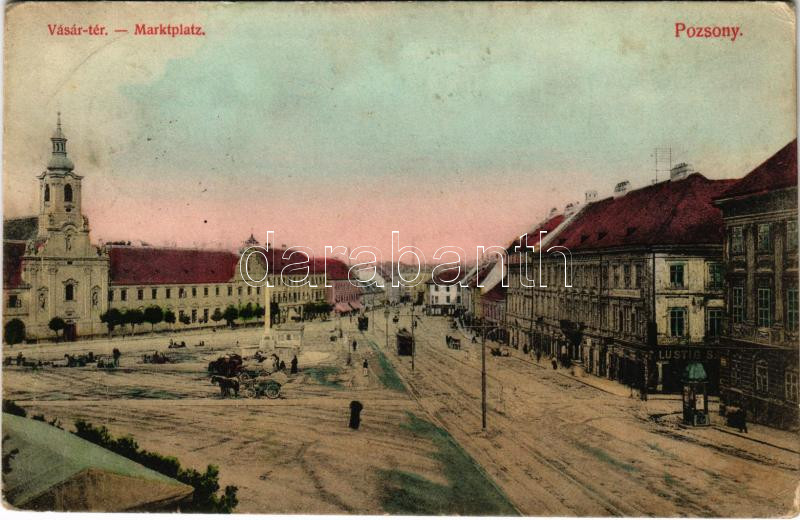 1908 Pozsony, Pressburg, Bratislava; Vásártér, villamosok, Lustig üzle... https://www.darabanth.com/hu/470-Gyorsarveres/470.0/Kepeslapok/Felvidek~2000007/1908-Pozsony-Pressburg-Bratislava-Vasarter-villamosok-Lustig-uzlete-Divald-Karoly-499-1907~II3177232