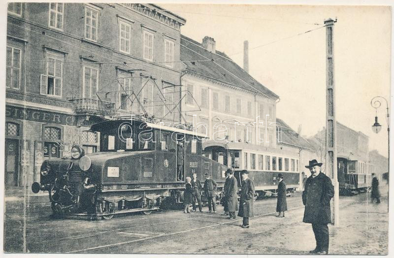 Leírás: 1914 Pozsony, Pressburg, Bratislava; Pozsony-Országhatárszéli Helyiérdekű Villamos Vasút (POHÉV) vasútállomása, bécsi villamos, Singer Co. üzlete / Elektrische Wien-Pressburg / Vienna-Bratislava Electric Railway Line, tram, shop