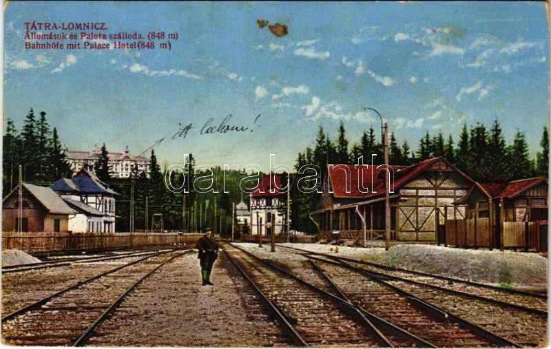 1916 Tátralomnic, Tatranská Lomnica (Tátra, Magas-Tátra, Vysoké Tatry); villamos vasúti állomás, vasútállomás, Palota szálloda. Kuszmann Gyula kiadása / Bahnhöfe mit Palace Hotel / tramway station, railway station, hotel (Rb)