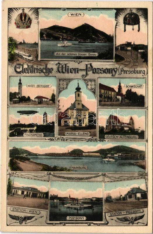 Pozsony, Pressburg, Bratislava; A Bécs-Pozsony elektromos vasútvonal állomásai; Bécs, Pozsony, Fischamend, Maria-Ellend, Deutsch-Altenburg, Schwechat, Hainburg / Elektrische Wien-Pressburg / Vienna-Bratislava Electric Railway Line and stations. Art Nouveau