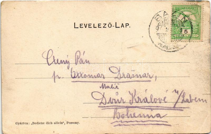 Leírás: Szentgyörgy, Pozsony-Szentgyörgy, Sankt Georgen, Svaty Jur pri Bratislave (Bratislava); Fischhof István kiadása. Bediene dich allein (szakadás / tear)