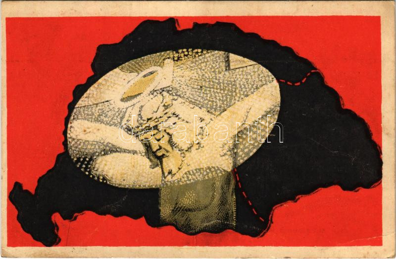 Megostoroztatott, kigúnyoltatott és keresztre feszíttetett. Kiadja Magyarország Területi Épségének Védelmi Ligája. Besskó Károly Grafikai Műintézete / "Hungary flogged, jeered and crucified" Hungarian irredenta propaganda s: Kardos Brunó (EB)