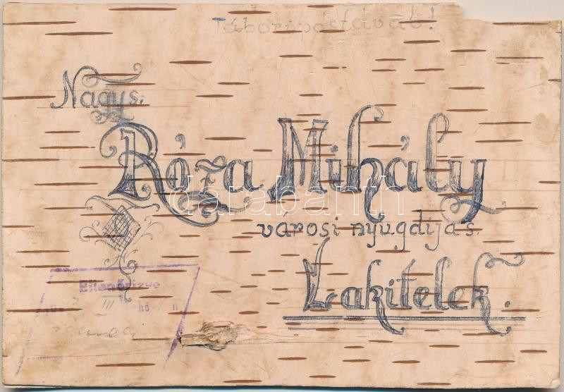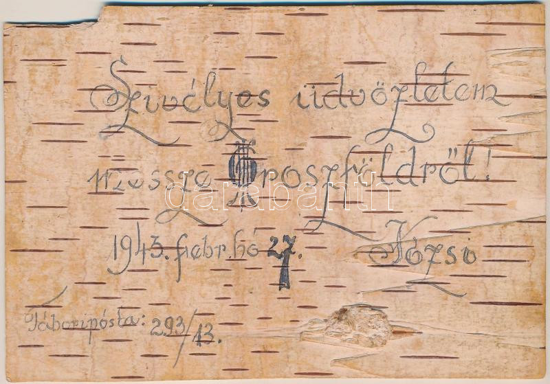 1943 Kézzel készített Tábori Postai Levelezőlap nyírfakéregből az orosz frontról Lakitelekre / WWII Hungarian military, hand-made field postcard made of birch tree bark sent from the Russian front