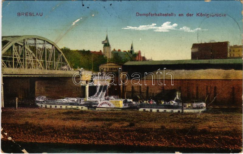 1913 Wroclaw, Breslau; Dampferhaltestelle an der Königsbrücke / steams... https://www.darabanth.com/hu/470-Gyorsarveres/470.0/Kepeslapok/Lengyelorszag~2000086/1913-Wroclaw-Breslau-Dampferhaltestelle-an-der-Konigsbrucke-steamship-station-bridge-fa~II3179395