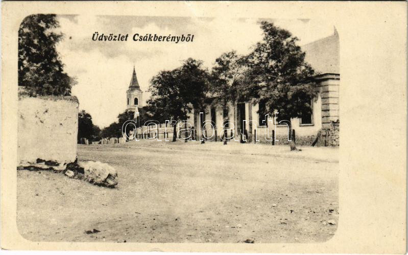 Leírás: 1926 Csákberény, utca, templom (gyűrődés / crease)
