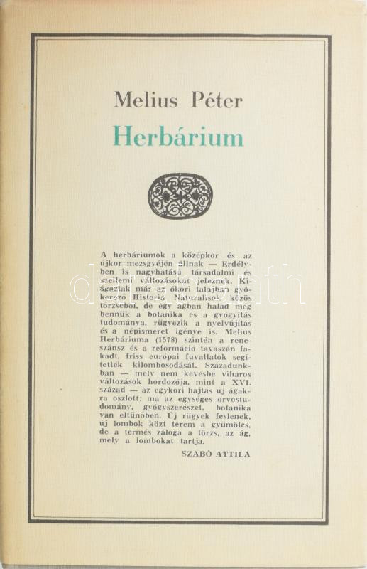 Leírás: Melius Péter: Herbárium. Az fáknak, füveknek nevekről, természetekről és hasznairól. Bevezető tanulmánnyal és magyarázó jegyzetekkel sajtó alá rendezte: Szabó Attila. Bukarest, 1979, Kriterion. Kiadói egészvászon-kötés, kiadói papír védőborítóban.