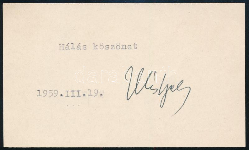 Leírás: Illés Béla (1895-1974) kétszeres Kossuth-díjas (1950, 1955) író, újságíró autográf aláírása kártyán
